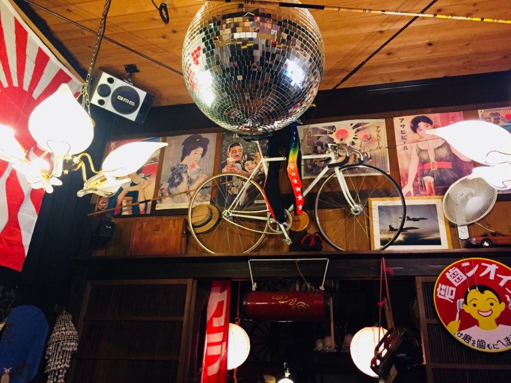 骨董品に囲まれた奥の部屋には、謎のミラーボールも!!カラオケもできるそうで、団体で来たら盛り上がること間違いなしです。
