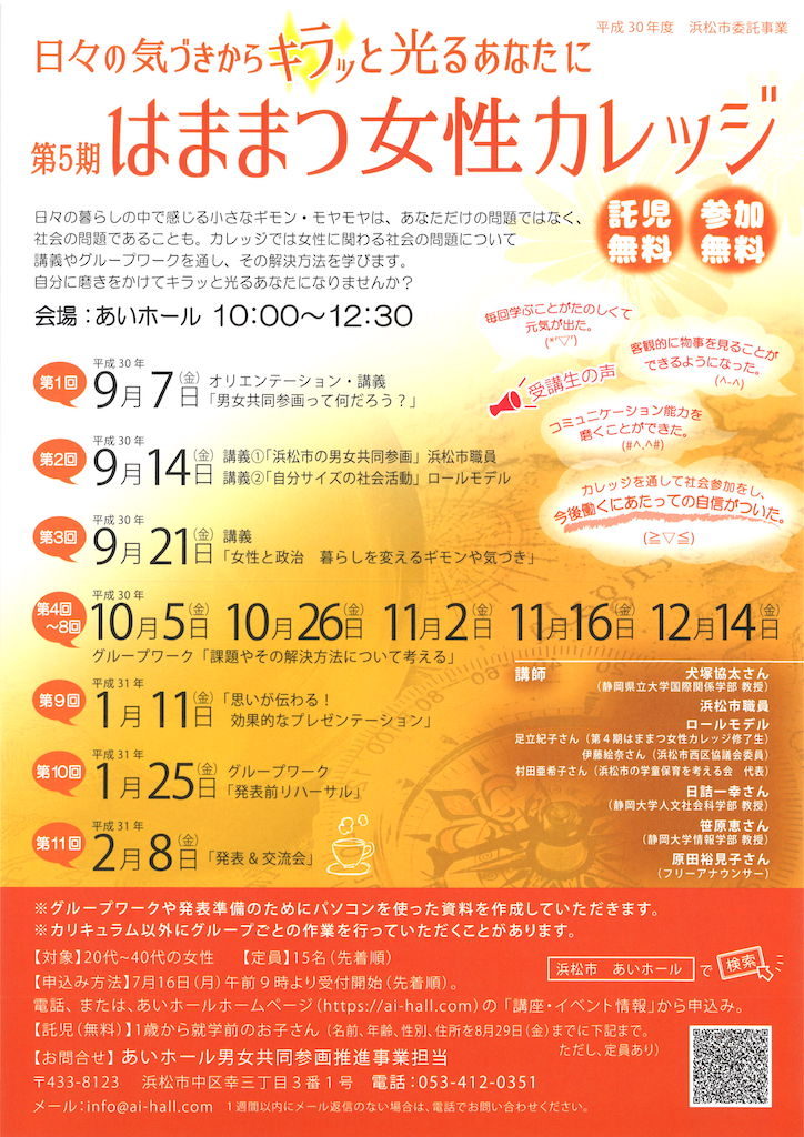 第5期はままつ女性カレッジ あいホール(浜松市中区幸3-3-1)