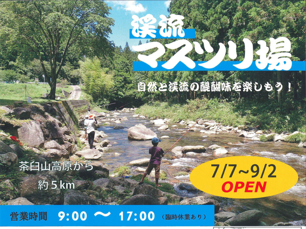 茶臼山高原の裾野・川字連の「横平川」に期間限定のマスツリ場がオープンします!竿・たも等の貸し出しがあるので手ぶらでOK!