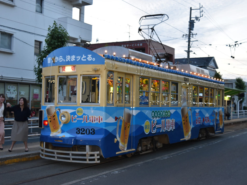 車内装飾で納涼感を演出した路面電車に乗り、冷たい生ビールを飲みながら車窓を流れる町並みを眺め、爽快にカラオケを歌って楽しい一時をお過ごしください♪