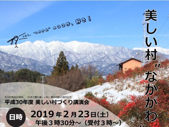 中川村発足60周年と「日本で最も美しい村」連合加盟10周年を記念し、このたび、「平成30年度 中川村美しい村づくり講演会」を開催します。