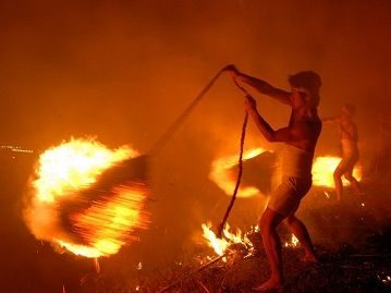 毎年8月15日の盆の夜精霊送りと悪霊鎮送の意味をこめて行われ、市内竹広地区の火おんどりと並び火を使う盆行事です。