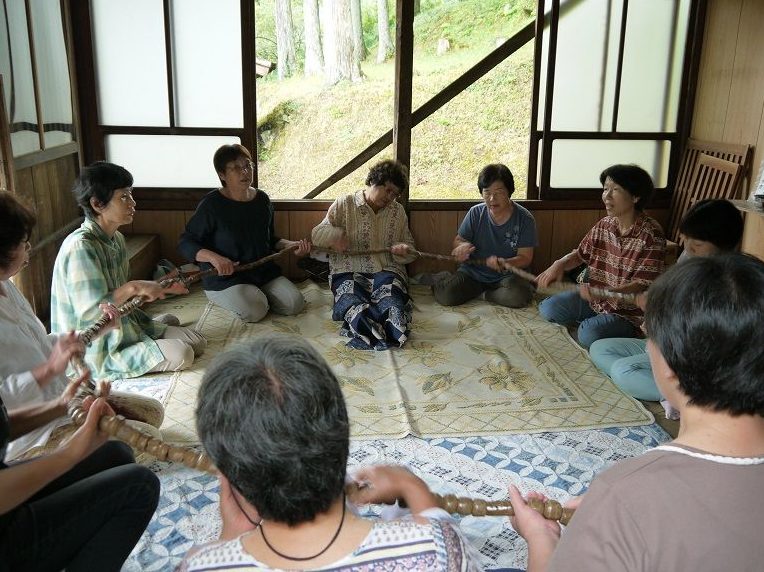 清崎の百万遍念仏は、一同が外陣に輪をつくって座り、大数珠を右に回しながら鉦の拍子で「南無阿彌陀仏」と念仏の唱和をします。