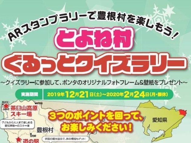 冬の豊根村の魅力を知ってもらうきっかけ作りとして、豊根村内の3つの施設を巡り、スマホアプリでクイズに答える「とよね村ぐるっとクイズラリー」を開催します。