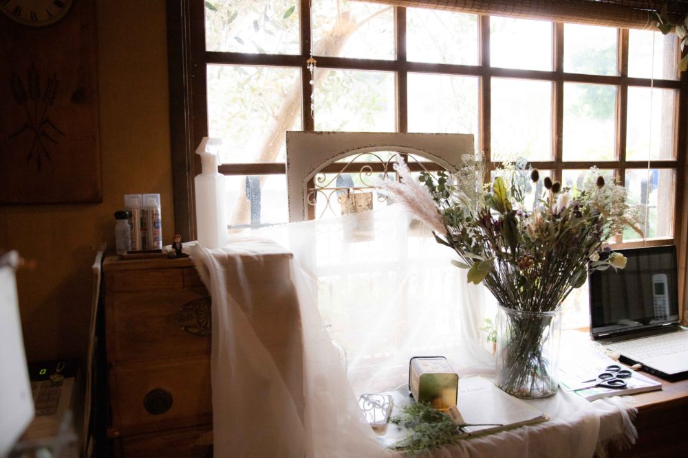 ディスプレイの家具もカントリー調でドライフラワーととてもマッチしていますね。店主さんのセンスの良さがうかがえます。木の香りとドライフラワーのほのかな香りが臨場感抜群です。