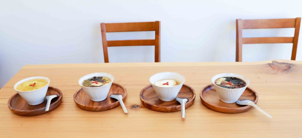 おしゃれな木のテーブルに並ぶ台湾のスイーツ豆花(と~ふぁ)どれも美味しそう。