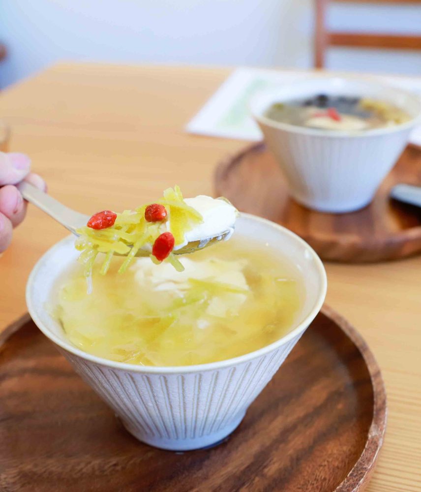 一口目でとても爽やかな味わい。豆花の柔らかさ、ふんわり、つるっとした質感とのどごし。とても美味しいです。レモンが酸っぱすぎずとても程よい甘さです。豆腐のこんなに柔らかな食感は初めてでした。シロップがまた美味しい。