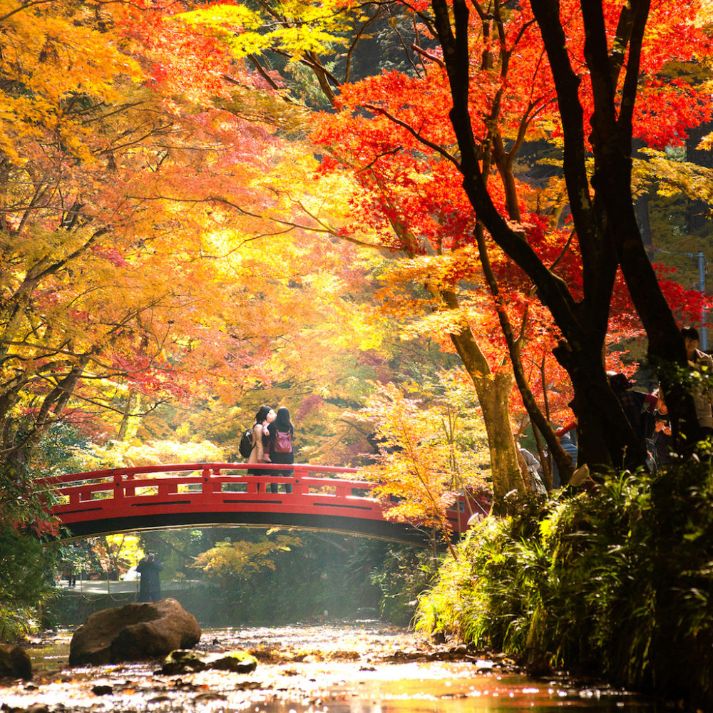 境内を流れる宮川沿いにある、大小約1000本のモミジが色づき、宮川沿いを歩きながら、紅葉狩りを楽しむことができます。