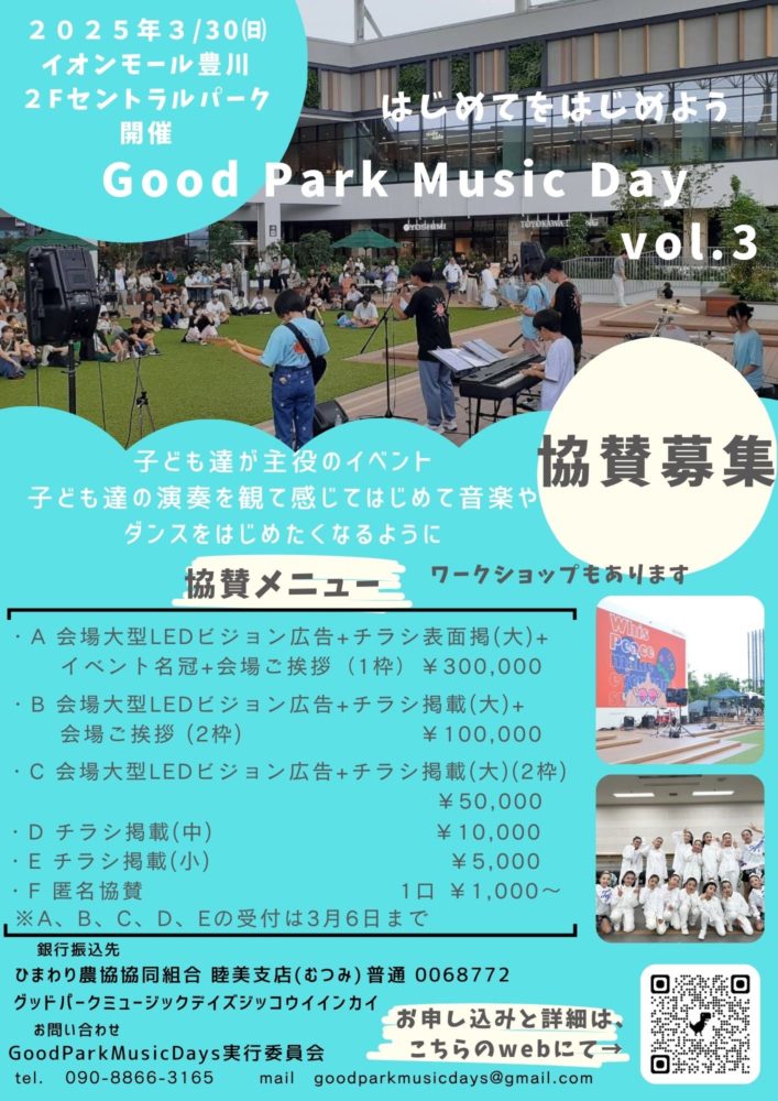 現在、今回で3回目の開催となるこの Good Park Music Days にご協賛いただける企業・団体様を募集しております!