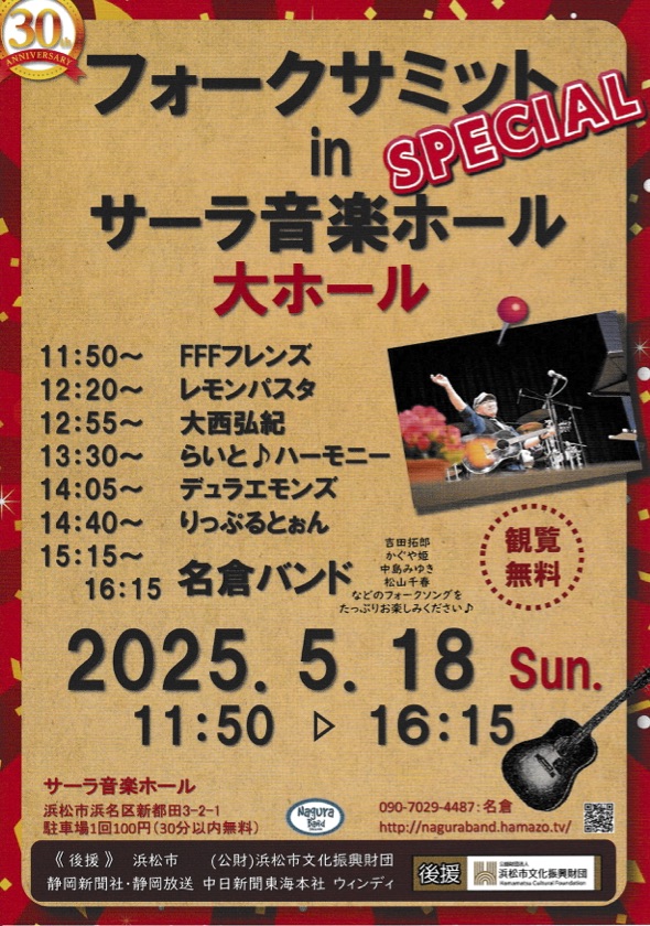 浜松市浜名区浜北界隈を拠点に活動する名倉バンド(名倉マコト)が行うアマチュアフォークコンサートです。