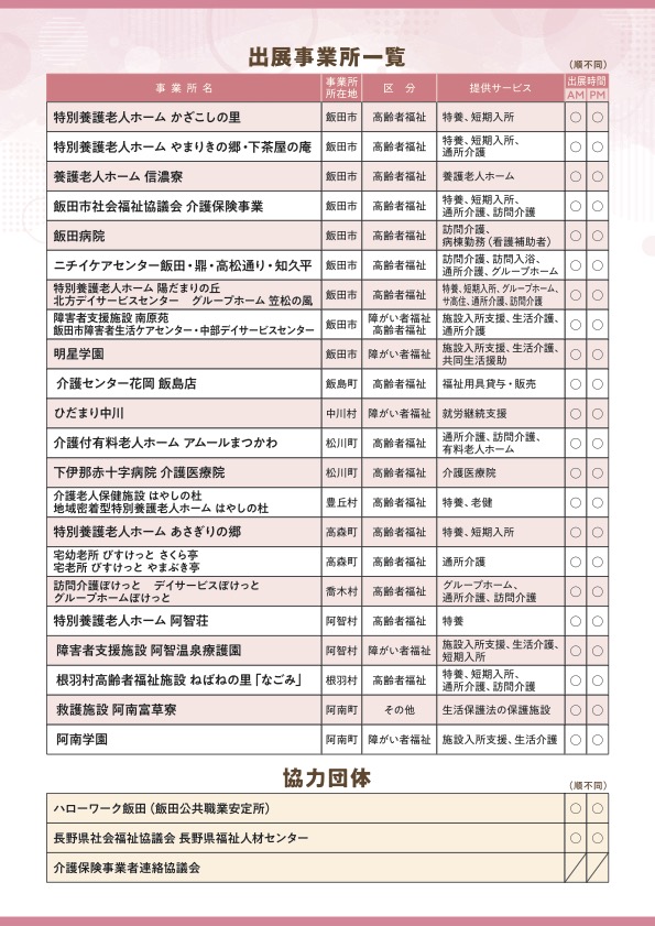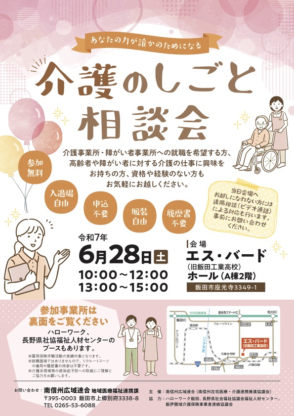 対象:介護事業所・障がい者事業所への就職を希望する方、高齢者や障がい者に対する介護の仕事に興味をお持ちの方、資格や経験のない方も気軽にお越しください。