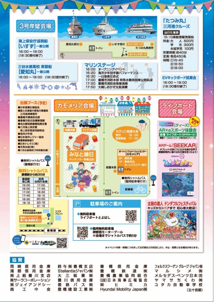 内 容:マリンステージ、「たつみ丸」三河港クルーズ、みなと縁日、海上保安庁巡視船「いすず」・