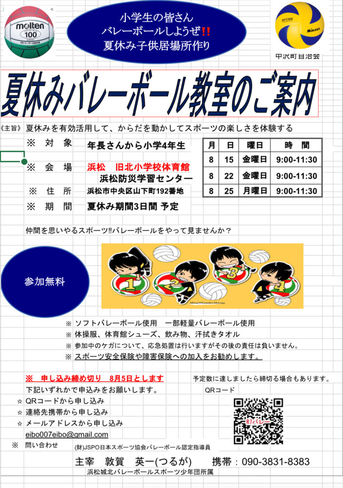 お申込みは下記連絡先携帯またはメールアドレス(eibo007eibo@gmail.com)またはQRコードから(8月5日締切)
