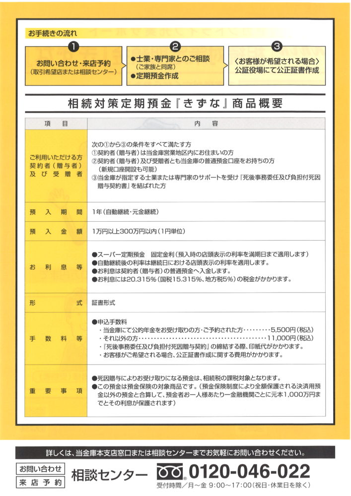 相続対策定期預金「きずな」 えんしんセカンドライフ充実サポート ZAZAmag編集部 3年前 相続対策定期預金「きずな」 えんしんセカンドライフ充実サポート 葬儀費用に関する不安を解消、士業や専門家がサポート。 お問い合わせ 遠州信用金庫 Enshu-Shinkin-Bank ➿0120-046-022 http://www.enshu-shinkin.jp +