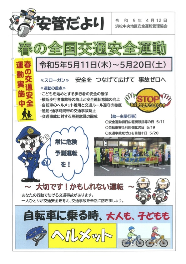春の全国交通安全運動 浜松中央地区安全運転管理協会からのお知らせ ZAZAmag編集部 3年前 2023.5.11(木)〜5.20(土)は春の全国交通安全運動です。 あなたの行動で防げる交通事故があります。 一人一人が交通安全を考え、交通事故を未然に防ぎましょう。 浜松中央地区安全運転管理協会 TEL :053-475-2540