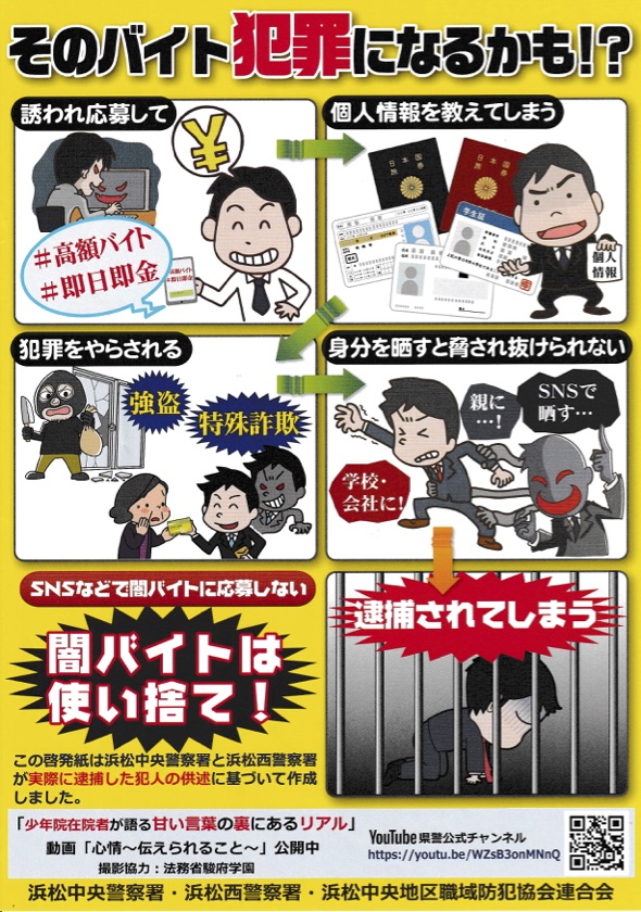 そのバイト犯罪になるかも!? 千輪 2年前 浜松中央警察署・浜松西警察署・浜松中央地区職域防犯協会連合会 動画「心情〜伝えられること〜」公開中 https://youtube.be/WZsB3onMNnQ