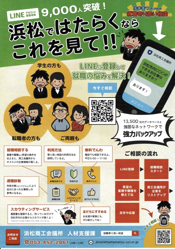 LINEに登録して就職の悩みを解決! 浜松ではたらくならこれを見て‼︎ 千輪 10か月前 お問い合わせ・ご相談 浜松商工会議所 人材支援課 tel.053-452-2861(9:00〜17:00) mail jinzai@hamamatsu-cci.or.jp https://www.h-yorisoi.com(就職寄り添い相談)