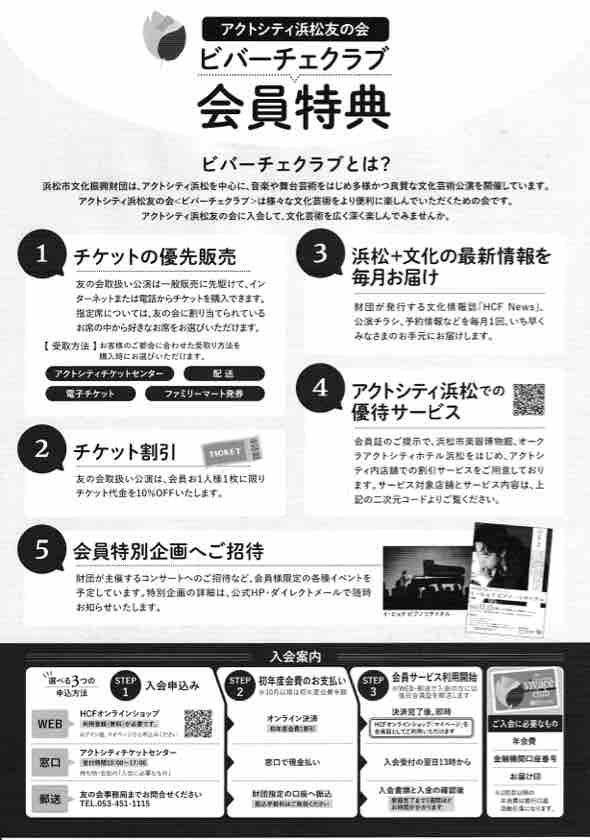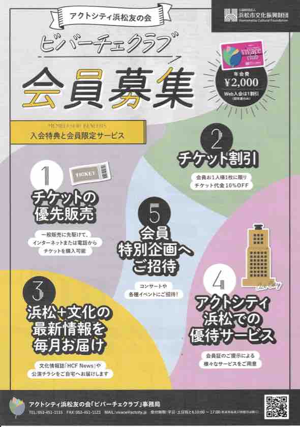 アクトシティ浜松友の会「ビバーチェクラブ」会員募集! 千輪 1か月前 アクトシティ浜松友の会「ビバーチェクラブ」事務局 TEL.053-451-1115/FAX.053-451-1123 https://www.hcf.or.jp/vivace/admission/