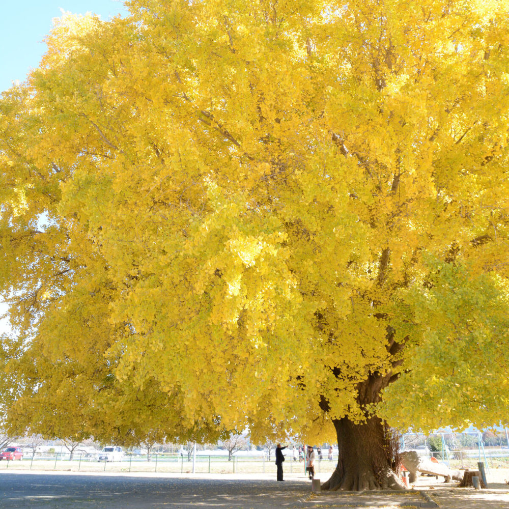 この大イチョウは、高さ約17㍍、樹冠幅は約25㍍という、樹齢102歳のとっても大きな雄(おす)の木です。