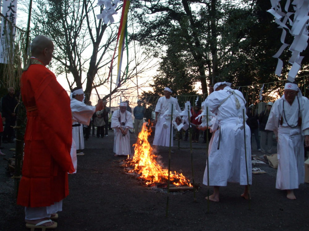 燃え上がる火のまわりで、行者は剣をかざして祈り、厄払いをします。