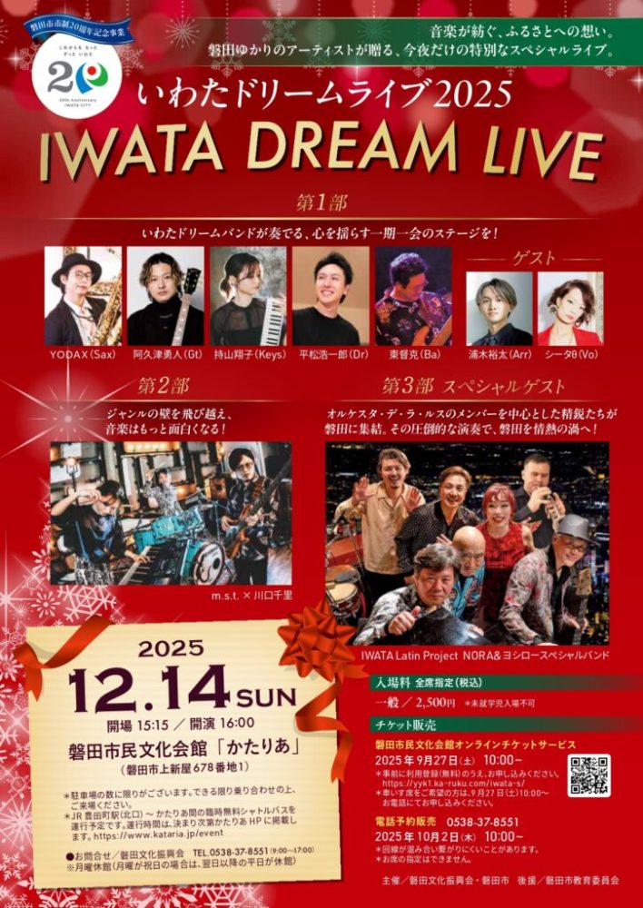| チケット販売 | 【オンラインチケット発売】 販売開始:令和7年(2025年)9月27日(土)10:00~ 磐田市民文化会館オンラインチケットサービス(座席選択可) https://yyk1.ka-ruku.com/iwata-s/ ※事前に利用登録(無料)が必要 【電話予約発売】 |