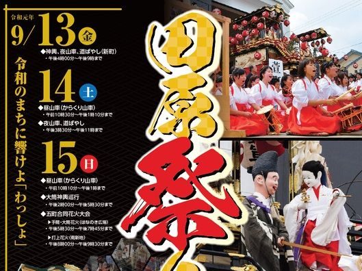 からくり人形を載せた山車、神輿、道囃子などが練り歩く田原伝統の祭りです。