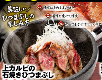 3種類の食べ方で楽しめる「上カルビの石焼きひつまぶし」最後まで美味しく楽しめます。