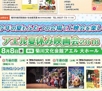 | 時間 | 午前の部 開場 9:15/野生のなまはげ 開演 9:30 ・SING 開演10:55 午後の部 開場13:00/野生のなまはげ 開演13:15 ・SING 開演14:40 |