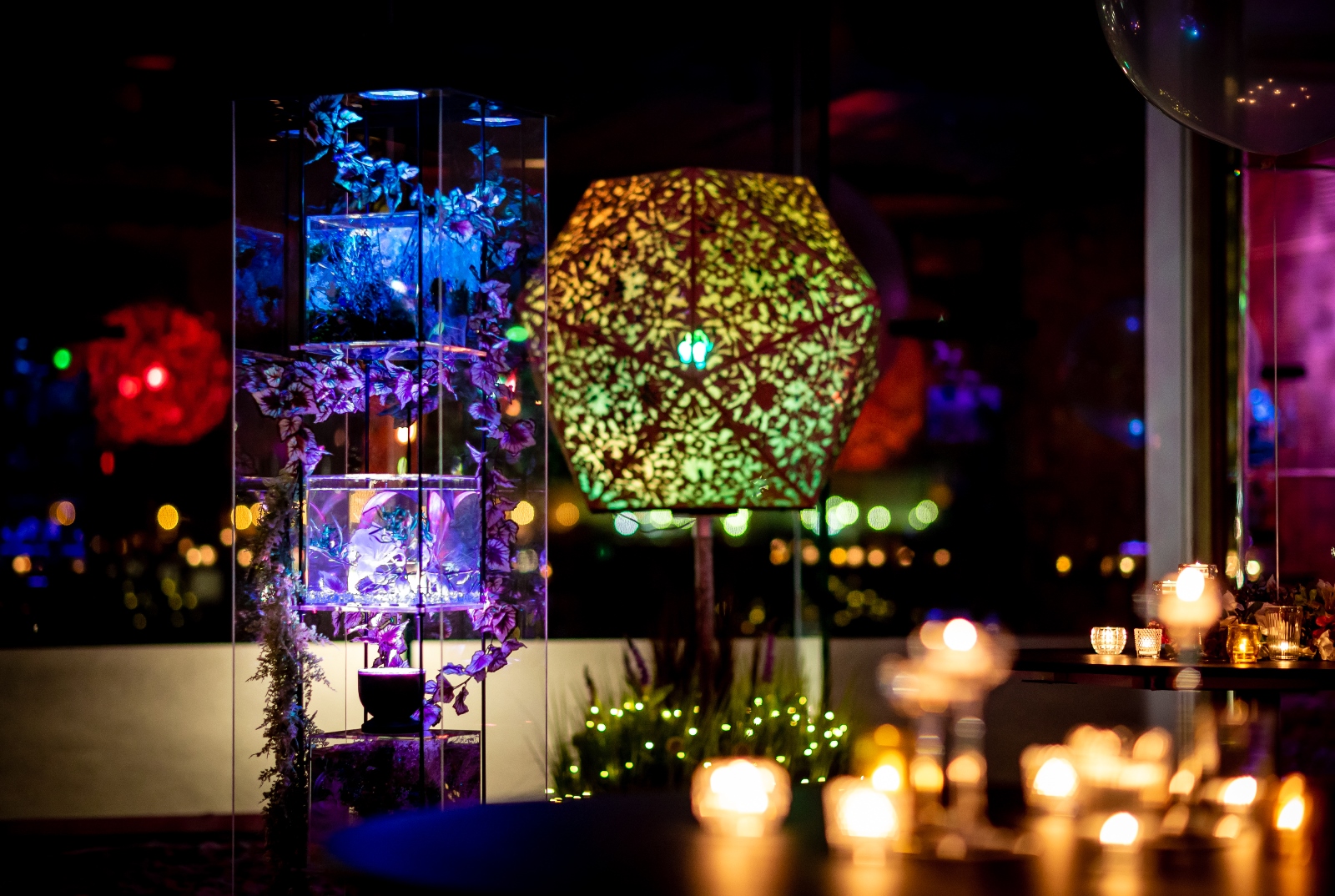 バンケットには、細かな花柄の透かし彫りを施した、直径約1.5メートル程度のMDF(中質繊維板)製のランプシェードを6個ほど立てます。ランプシェードには色の着いたランプを入れています。灯りをつけると、幾何学模様のカラフルな光と影の万華鏡のようなアートが、天井や床、壁一面に広がります。直径1.8メートル程の透明のバルーンも設置し、そのバルーンめがけてプロジェクターで万華鏡の映像を投影します。