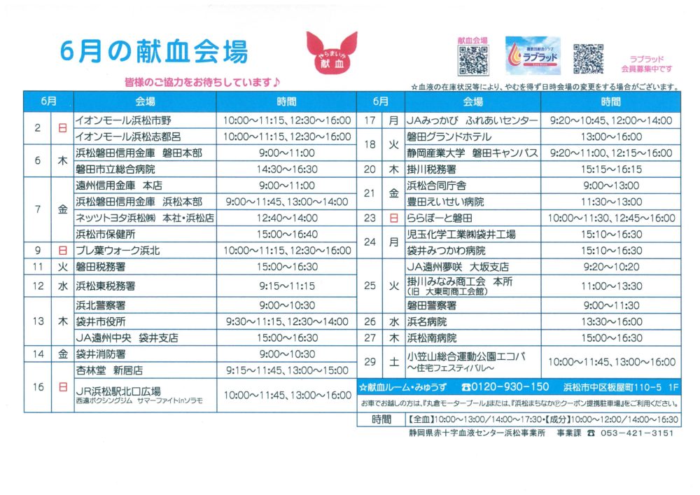 静岡県赤十字血液センター浜松事業所からのお知らせです。