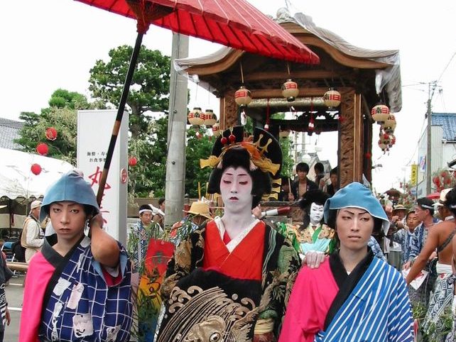 国府大社神社の祭りで、上町、中町、下町、南田の4町内がそれぞれ山車をひき、真夏の炎天下を「歌舞伎行列」が旧東海道を練り歩きます。