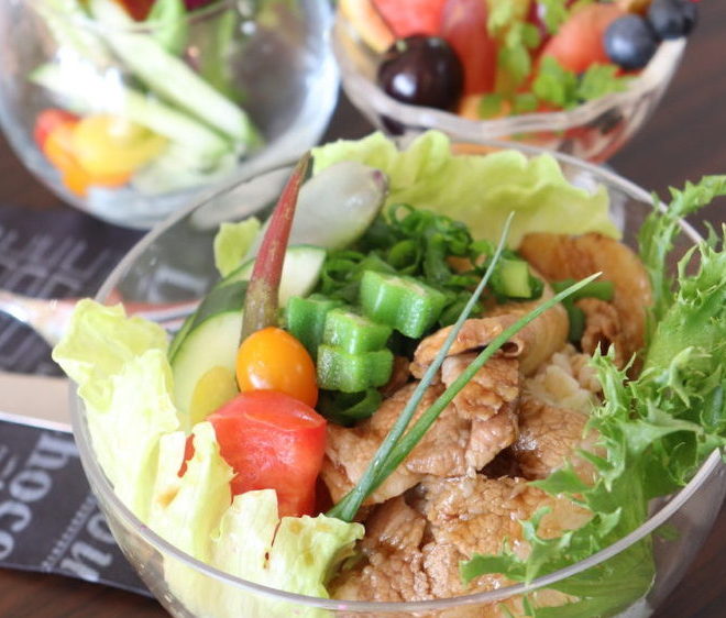 野菜と浜名湖のもち豚をたっぷり使った照り焼き丼。人気の「ポークボウル」は、写真奥の野菜サラダとフルーツがセットになって、650円!!。野菜やフルーツは日替わりです。ボリューム満点でかつヘルシーなのがうれしいですね。