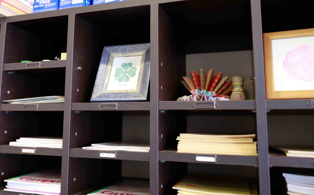文房具の棚に春太郎さんの作品がさりげなく飾られています。
