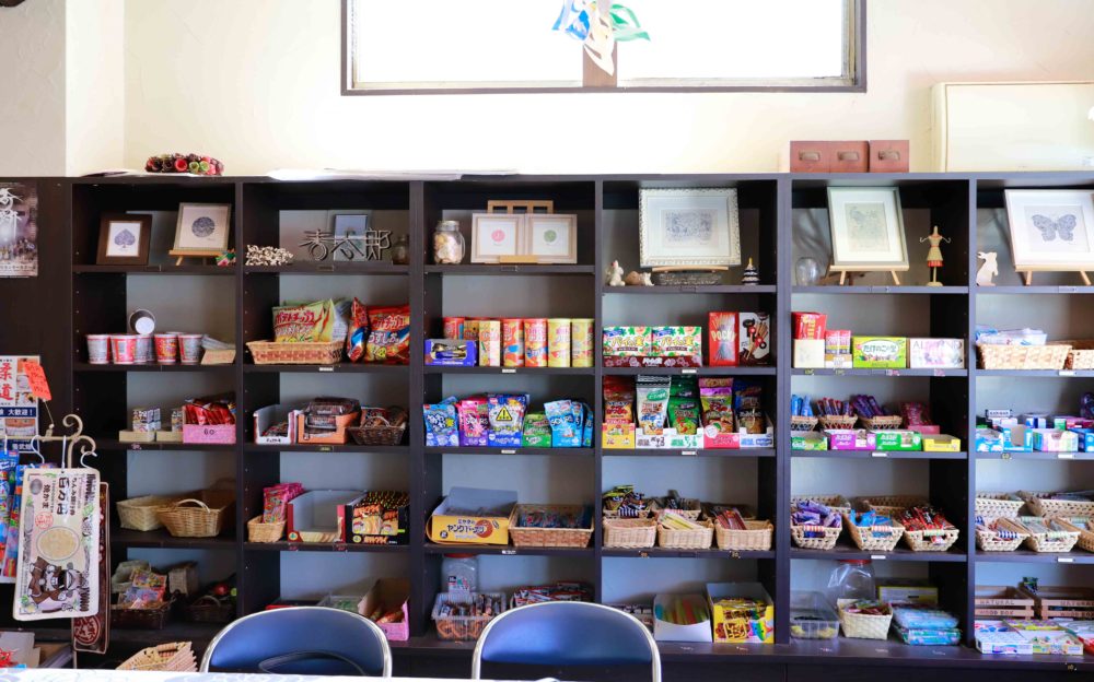お店の中で。店内は小学生の文房具、駄菓子なども販売されています。