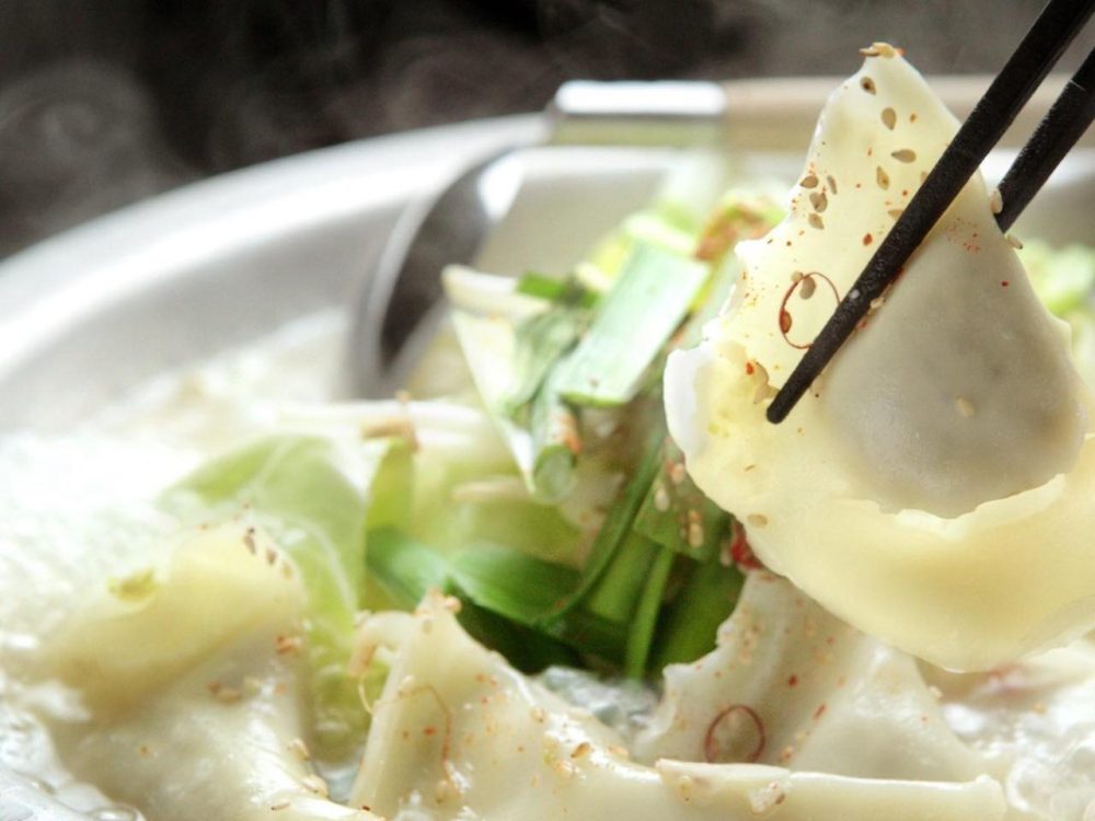 錦爽鶏の鶏ガラをベースに厳選された素材を加え、じっくり煮込んだ黄金色のスープが自慢。博多鍋の極上スープをご賞味ください。
