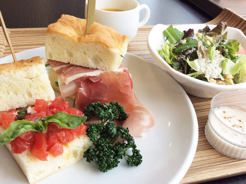 ・生ハム&フレッシュトマトの自家製フォカッチャのサンドウィッチ・シーザーサラダ・10種野菜のミネストローネのセット/800円