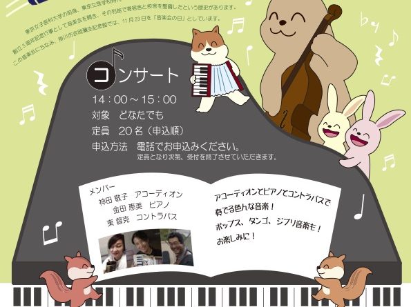 今回は、アコーデオン・ピアノ・コントラバスによるコンサート。アコーデオンとピアノとコントラバスで奏でる色んな音楽!ポップス、タンゴ、ジブリ音楽も!お楽しみに!