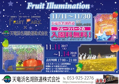 『はままつフルーツパーク時之栖』のイルミネーション開始に合わせて期間限定で天浜線ではままつフルーツパーク時之栖にお越しいただくと、なんと、入園無料になります。11/11(土)~11/30(木)の期間限定です!夜のイルミネーションはもちろん、昼間に入園可能なので、昼間の園内もお楽しみください。入園無料券は列車降車時に乗務員にお申し出ていただき受け取ってください!ぜひ、この機会に天浜線とはままつフルーツパーク時之栖をご利用ください!