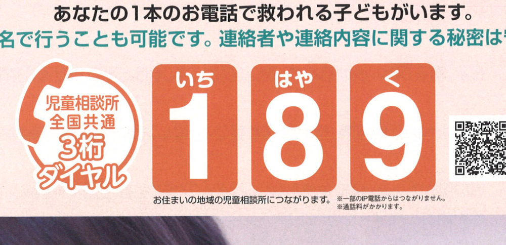 児童相談所(全国共通の3桁)ダイヤル189番です