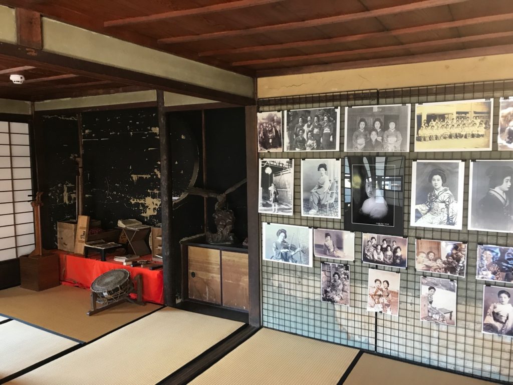 芸者さんの写真や、実際に芸者さんが使っていた当時の化粧道具や楽器などがずらり。かつての雰囲気を残しています。