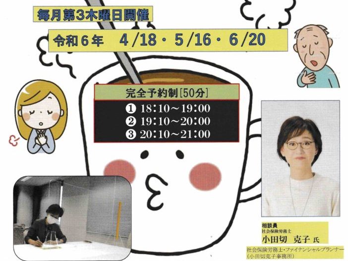 時間:<完全予約制(50分)>①18:10〜19:00/②19:10〜20:00/③20:10〜21:00