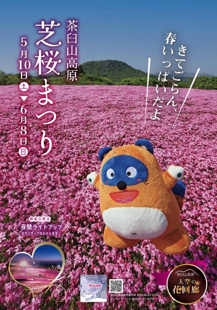 標高1,358m、愛知県で一番高いところにあるお花畑。おすすめポイントは南アルプスの雄大な山々を眺めながら芝桜が楽しめる山頂、幻想的な雰囲気になる夜のライトアップ、お腹も満たせる各種グルメや豊根村の特産品だ。