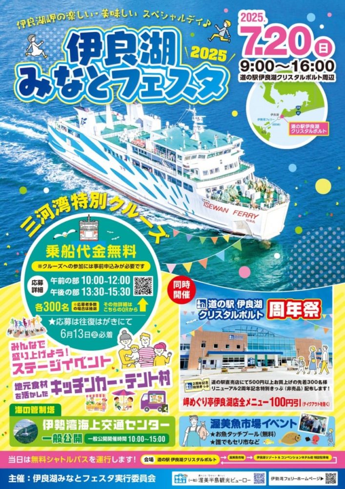 また、道の駅伊良湖クリスタルポルト周年記念祭や伊勢湾海上交通センター施設の一般公開、渥美魚市場イベントを同時開催いたします。