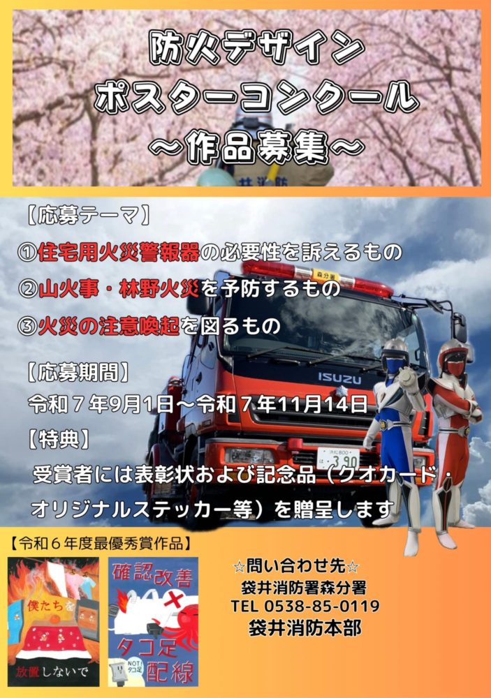 袋井消防本部では、次代を担う世代(中学生、高校生)を対象に、火災予防についての意見や考えを自由な発想でイメージし表現することを通じ、防火防災に関する意識及び知識の向上を目的として、「令和7年度防火デザインポスターコンクール」を開催します。