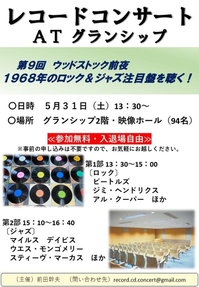レコードコンサート ATグランシップ 第9回ウッドストック前夜1968年のロック&ジャズ注目盤を聴く!