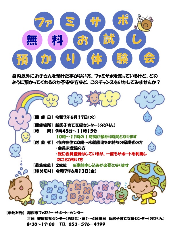 湖西市 ファミサポ 無料お試し預かり体験会 6/17(火)