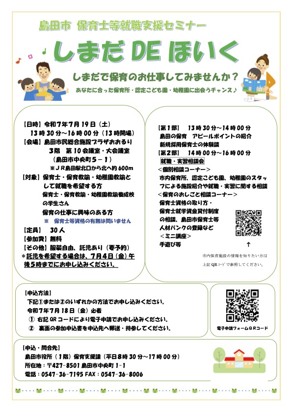 保育士・保育教諭・幼稚園教諭の資格をお持ちの方や保育士等養成校に在学中の学生さん、保育士等の資格はないけれど保育の仕事に興味がある方を対象に、島田市保育士等就職支援セミナー『しまだDEほいく』を開催します。