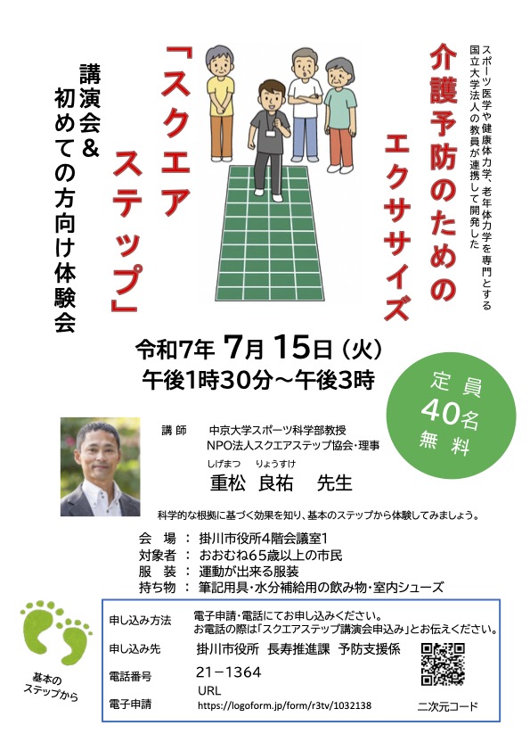 掛川市では、介護予防に取り組む市民を増やすため、介護予防の新しいエクササイズ「スクエアステップ」講演会&はじめての方向け体験会を開催します。