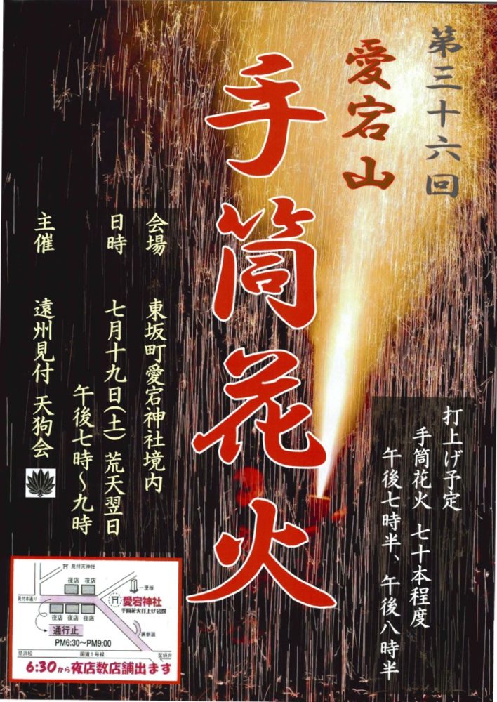 旧東海道筋の突き当たりにある愛宕神社の境内にて、迫力満点の手筒花火を間近で見ることのできる花火大会が行われます。