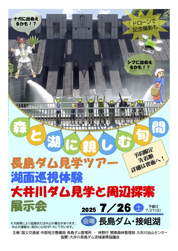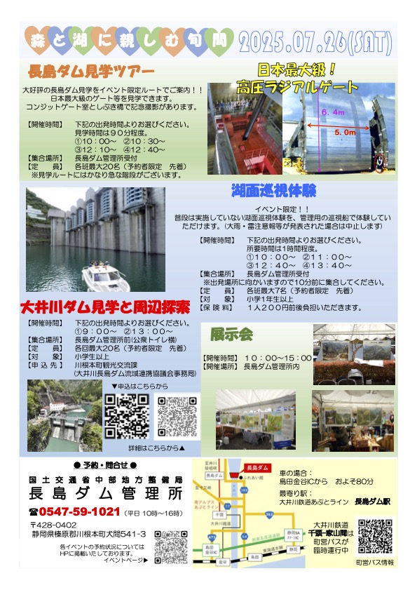 ※「長島ダム見学ツアー」、「大井川ダム見学と周辺探索」、「展示会」は無料